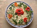 Сверху засыпать натёртым сыром, украсить цветами из солёной рыбки + зеленюшка.