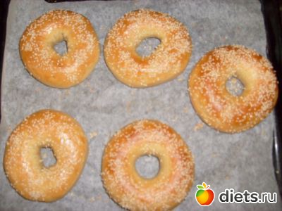 Опустила Biagls в кипящую воду на 1,5-2 мин (некоторые могут утонуть, но они тут же всплывут), перевернула и сразу вынула. Когда тесто опускается в кастрюльку с кипяченой водой (кстати я с огня кастрюльку не снимаю, она так и кипит все время (но не сильно)) бейгл сразу увеличивается в объеме. Снимаю их с кастрюльки шумовкой. Потом + они еще немного увеличиваются в объеме в духовке. Уложила на противень, смазанный маслом или застеленный бумагой для выпечки.