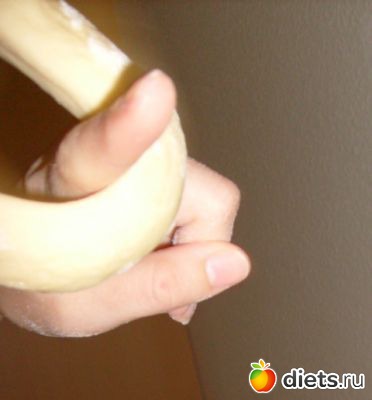 палец окунула в муку и сделала в середине булочки дырку и начала крутить тесто вокруг пальца. Таким образом отверстие в булочке увеличивается
