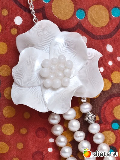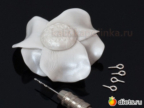 После этого цветок запекаю в течение 10 минут. Теперь нам понадобится молд, даже плоская текстура подойдет. Мы будем делать обратную часть цветка. Ведь все должно быть прекрасно, даже изнанка. Небольшой шарик из полимерной глины немного сплющиваем и делаем оттиск. Низ цветка смазываем гелем и сажаем на него наш чашелистик. Эта обратная часть кроме декоративной функции имеет и полезную, она приподнимает цветок над кожей, жемчужины красиво лягут под лепестками, кроме того под мелким узором Ваша кожа не будет перегреваться, как бывает с крупными украшениями. Запекаем еще раз всю конструкцию до полной полимеризации. Здесь важно сохранить температурный режим и время запекания. Белая глина легко изменяет цвет при нарушении режима.