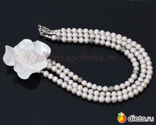 Теперь прикрепляем к нашему коннектору ювелирный тросик с помощью кримпов, зажимаем кримпы, нанизываем жемчуг в 3 нити. На верхней нитке ставлю разделительные бусинки. Все нитки разной длины, размер определяется опытным путем. У меня при размере жемчужинки 7 мм получились такие нитки: нижняя 43 бусинки, вторая 41, третья 39 шт.