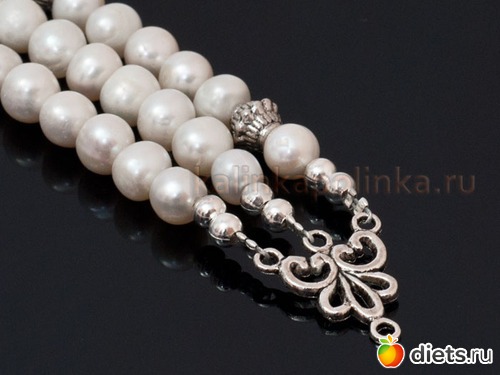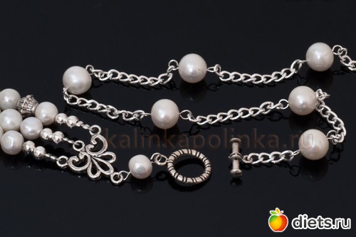 теперь к коннектору присоединяю застежку-тоггл, вторую часть тоггла прикрепляю к цепочке, между отрезками цепочки креплю жемчужины на пинах с ушком. Для жемчуга лучше использовать тонкие пины толщиной 0,5 мм, т. к. отверстия в жемчужинках чаще всего очень маленькие.