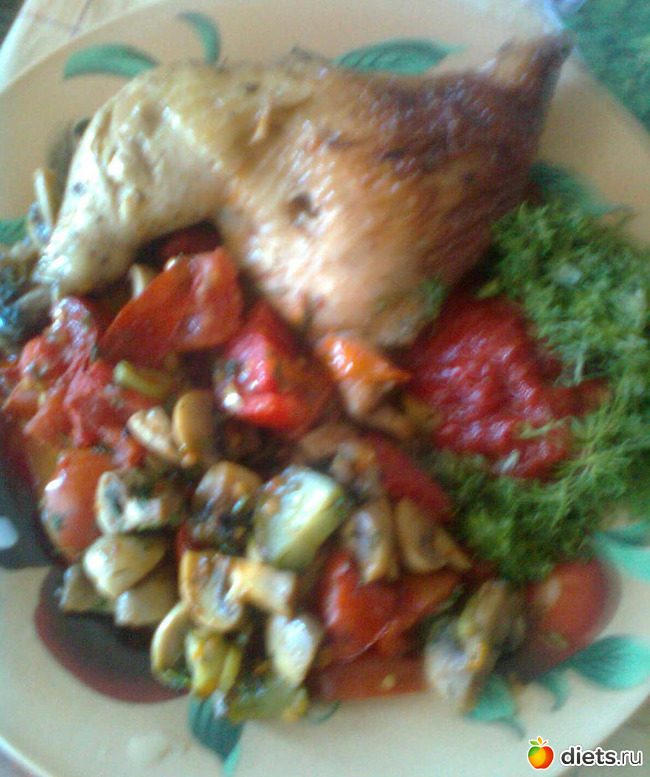 на гарнир: шампиньоны, огурцы, помидоры - тушеные с капелькой оливкового масла,