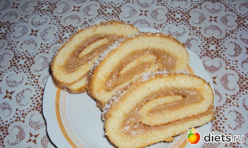 Готовый горячий корж смажьте любым заварным кремом (немного оставьте для обмазки верха рулета), джемом или густым вареньем, быстро сверните в рулет, аккуратно освобождая от бумаги, и поставьте в холодное место для остывания и пропитки.