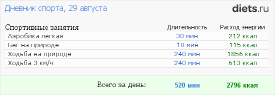 Кстати, сегодня решила внести в дневник питания и спорта свои «достижения». Честно говоря, дневник спорта меня огорошил! Неужто на самом деле сожгла столько калорий??? Что-то мне не верится!..