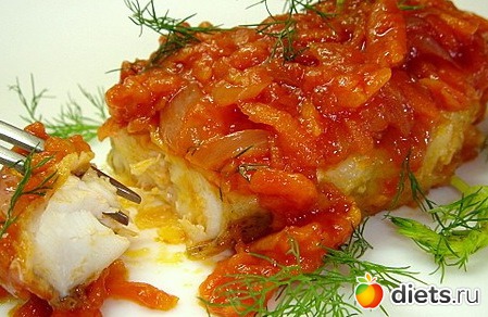 Сделав разрез на брюхе, рыбу очистить от чешуи и внутренностей, разрезать на порционные куски вместе с костями. Вынести на холод. Мелко нарезать лук и чеснок, пассеровать их на горячем масле в глубоком сотейнике. Когда лук начнет румяниться, прибавить к нему нарезанные мелкими кусочками помидоры, предварительно очищенные от семян, нарезанные мелко шпинат, щавель и рубленный зеленый лук, пассеровать все до мягкости. Затем прибавить мелко нарубленной зелени (укропа, петрушки), соли, перца, залить все холодной водой в таком количестве, чтобы она могла покрыть рыбу, дать вскипеть под крышкой. После этого положить в сотейник очищенную рыбу, закрыть крышкой и варить до мягкости на слабом огне. Когда рыба сварится и сок загустеет, выложить все на глубокое блюдо. К этому блюду подавать ломтики лимона. Блюдо очень вкусно в холодном виде.