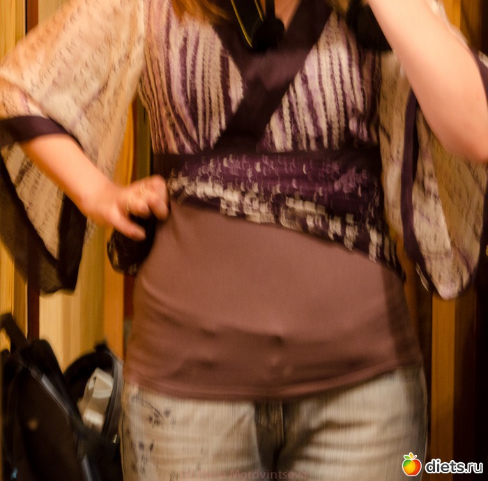 блузка из чистого шелка, очень приятная и легенькая! я так расстраивалась, что не смогу ее надеть в Японию (т. к. в марте этого года она на мне не застегивалась), а теперь получается, что смогу ))) а то гляди и велика мне станет ))) хотя нет, в груди пока еще самое то