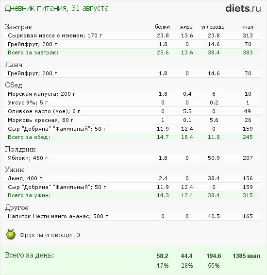 Сама даже не знаю, почему меня так отвешивает. Кушаю я плотненько и вкусненько, вот питание за вчера (каждый день кушаю на 1200-1300 ккал)