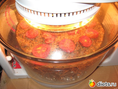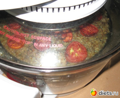Гречка с грибами обед гречка с грибами и помидорами: вечером залила кипятком гречку, утром открыла грибы добавила запаренную гречку, добавила специи для плова и сухую морскую капусту перемешала, положила на сковородку сверху нарезала помидоры и в Аэрогриль на 20 минут температура 250 градусов