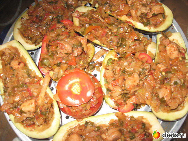 Рецепт такой :Разрезаем баклажаны пополам и ложкой вырезаем мякоть, режем мелко. Сладкий перец разрезаем пополам и выбираем семена и у помидора выбираем серединку.