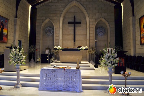 Теперь хочу написать о Свадьбе. Классической западной как в кино - Моя большая Греческая свадьба. Празднование началось за несколько месяцев - и мальчишники и девишники обязательно. Затем Церемонии в Провославной Церкви и Ливанскй Церкви. И гуляние до утра в ресторане с песнями и плясками... а в сл дни продолжение праздника в семьях и домах родителей невесты и жениха... короче здоровье надо иметь крепкое - что бы выдержать это испытание. Я делаю фотоотчет из Ливанской церкви и ресторана. Так выглядит алтарь перед церемонией.