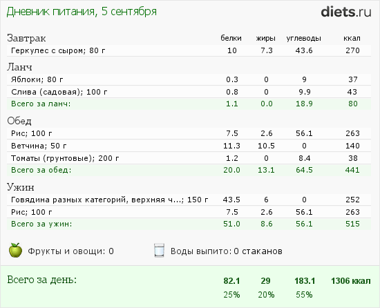 Получилось четыре приема пищи, три основных и перекус фруктами на ланч.