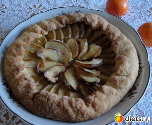 По кругу выкладываем яблоки, отступая от края ~4см. Сверху кусочками выкладываем оставшееся сливочное масло (30гр) и посыпаем сахаром. Заворачиваем края галеты и ставим в разогретую духовку. Печем до готовности яблок и красивого румяного цвета.