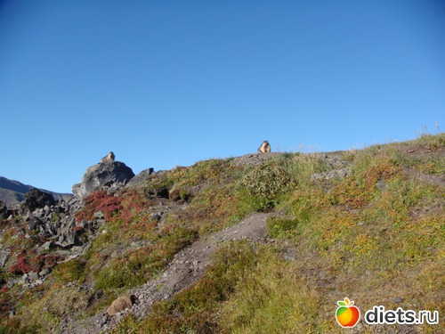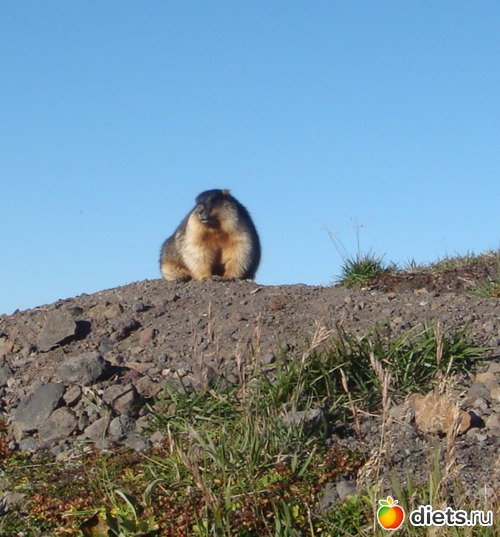 Подниматься было сложновато из-за того, что вначале надо подниматься по мелким камешкам (ноги скользят). Но мы это сделали! И на вершине нас встретили... суслики (черношапочные, эти побольше и потолще евражек).