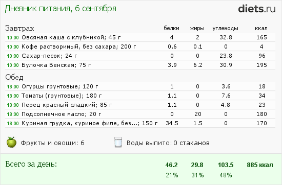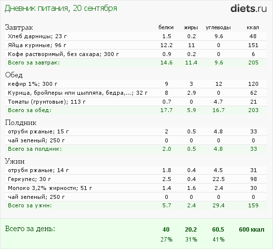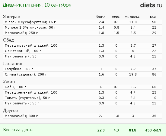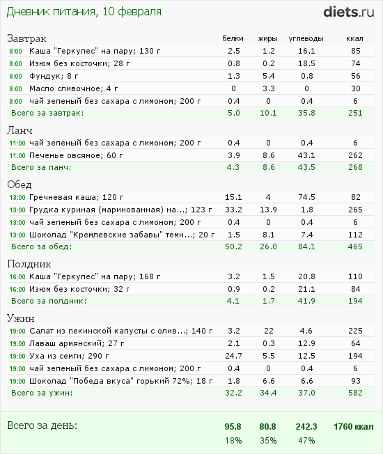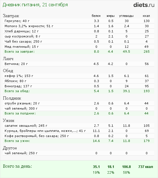 Теперь, рассчитав для себя размер ООВ, вы можете узнать суточную потребность в калориях (СПК) в зависимости от вашего коэффициента физической активности (КФА). 1.3 для сидячего образа жизни, 1.4 для среднего уровня активности, 1.5 для активного образа жизни, и 1.75 для крайне активного. Умнижв ООВ на этот коэффициент вы узнаете вашу суточную потребность. Т.е если у женщины средняя физическая активность, то 1467,5 умножаем на 1,4 = 2054,5 ккал. Чтобы похудеть, нужно рассчитать дневную норму калорий, затем вычесть из этой цифры не больше 300 — 400, и строго придерживаться полученной цифры. Важно, что резкое сокращение потребляемой энергии очень вредно, и ведет к набору жира. А какие цифрв у вас в дневниках питания - 737 ккал, 600 ккал, 453 ккал. Девочки, либо вы что-то не так считаете, либо вас бы уже не было, организм бы не выдержал.