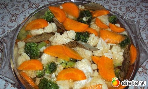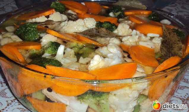Цветную капусту и брокколи разделить на маленькие соцветия, морковь нарезать тоненькими колечками (если крупная, то полукольцами), чеснок нарезать тонкими пластиночками, перемешать, уложить в банку или стеклянную кастрюлю, залить горячим маринадом.