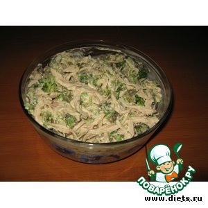 Остывшую курицу разделить на волокна, брокколи порезать не слишком мелко. Огурцы мелко нарезать. Все вместе соединить и заправить майонезом. Украсить зеленью.