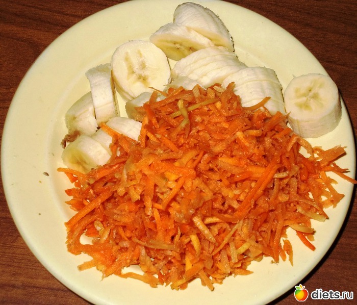 Немного солим. Морковь натираем на тёрке, банан режем произвольно.