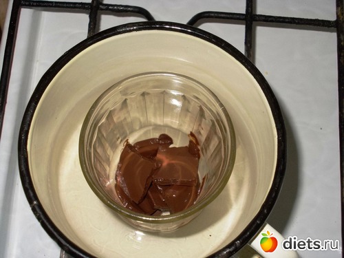 Шоколад растапливаем на водяной бане, нужно добавить 3-5 ложек кипяченой воды, постоянно помешивая. Доводя, таким образом, шоколад до консистенции густой сметаны.