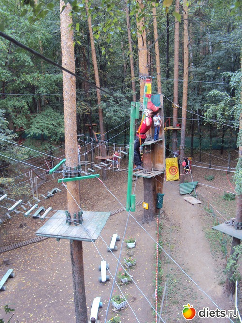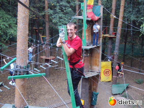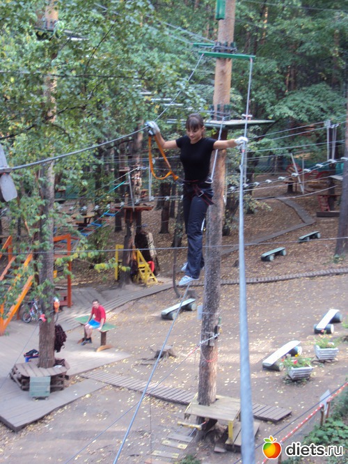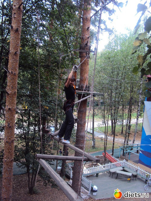 И вчера мы в парке пошли на аттракцион "Маугли". Там различные трассы разной сложности и высоты. Необходимо с помощью ролика, карабина, своих физ. сил преодолеть трассу. И на средине пути нельзя остановиться - не получиться оттуда спуститься. Мы конечно же пошли на самую-самую - высота 9 м. Хапнули адреналина, было весело. Вот несколько фоток: