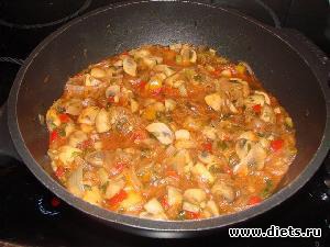 Положить болгарский перец, и обжаривать, помешивая, ~5 минут. В сковороду добавить грибы и жарить, помешивая, ~7-8 минут. Добавить томатную пасту или соус и хорошо перемешать.