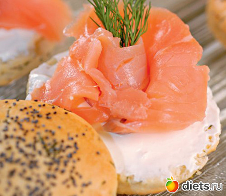 Филе лосося нарезать тонкими кусочками. Разрезать каждую булочку вдоль пополам, щедро смазать сметаной. Сверху положить по кусочку лосося.