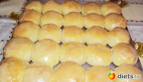Выложить булочки на смазанный противень и выпекать в разогретой духовке 35-40 минут при температуре 180 градусов.