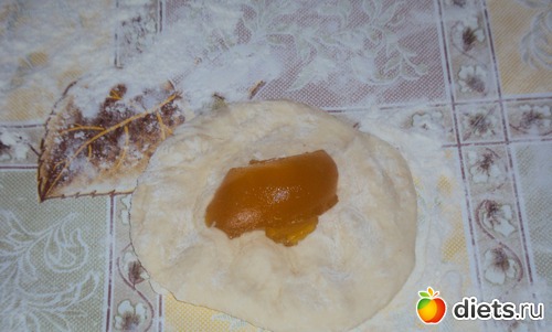Каждый кусочек скатать в шарик, прижать ладошкой на столе, положить по ложечке джема, хорошо защипать, придать форму шарика.