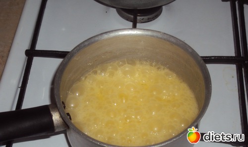 Убавить огонь и варить помадку 5-6 минут, помешивая. В конце варки влить 1/2 ч. л мятной настойки, перемешать и дать покипеть несколько секунд.