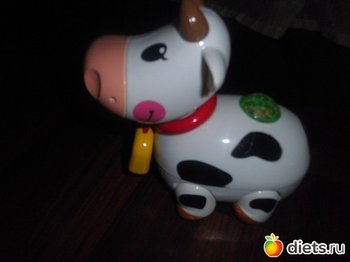 Жених нам подарил корову прикольную, она на батарейках и поет, ездит в разные стороны, а если с чем сталкивается, то едет назад.
