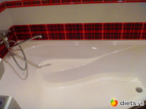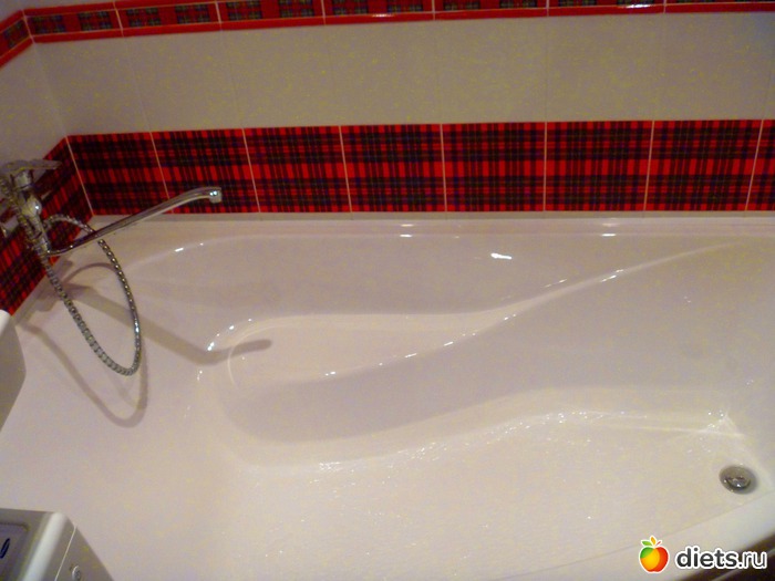 А вот и сама ассиметричная ванна с широкой спинкой, в которой достаточно просторно разместятся двое взрослых.