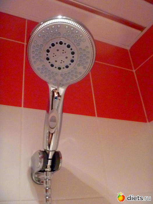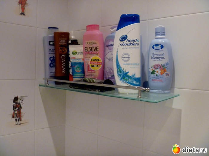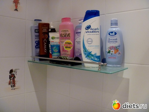 Непосредственно над ванной сбоку висит стеклянная полочка для косметики
