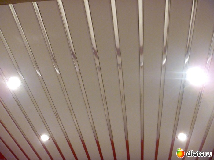 Ну и наконец, реечный потолок с точечными светильниками и хромовыми вставками, которые отлично гармонирует со смесителем и аксессуарами
