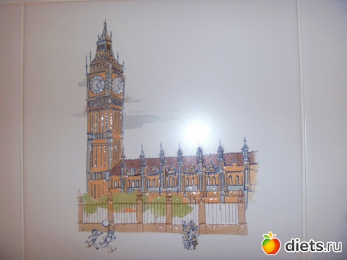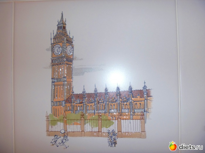 В середине композиции главная достопримечательность - Биг-Бен — часовая башня в Лондоне.