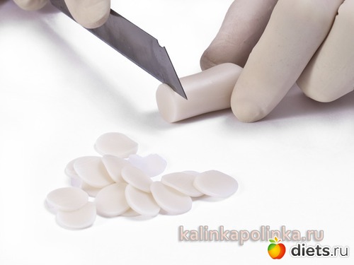 Сначала делаем розочки. Катаем колбаску толщиной около 1 см, нарезаем ее кусочками примерно по 1мм. Пластика должна быть упругой и достаточно мягкой.