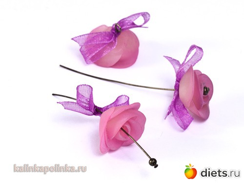 Розочки испеклись, лепестки должны немного пружинить и не трескаться от нажатия. Нанизываем на пин шарик, розочку и бантик из органзы, загибаем пин ушком как на обычной бусинке.