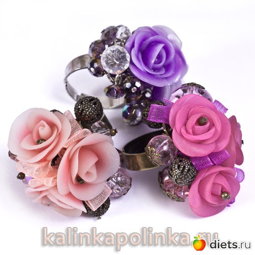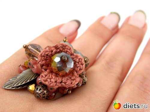 Собираем кольцо. Схема такая же, как и в кольце с обычными бусинами, только по центру вместо крупных бусин прикрепляем розы, а вокруг заполняем пространство небольшими стеклянными бусинами. Все, любуемся красотой!!!