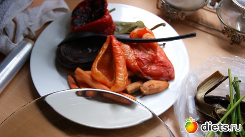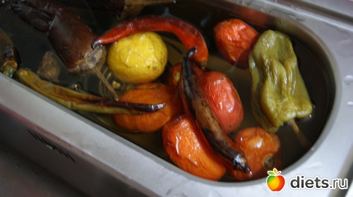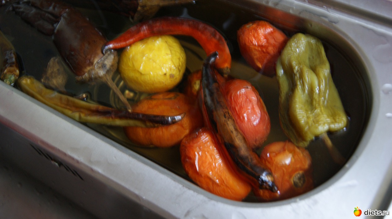 Баклажаны, перцы, перцы чили, морковь (это уже мое дополнение), помидоры - все это запекла и вот они в холодной воде остужаются
