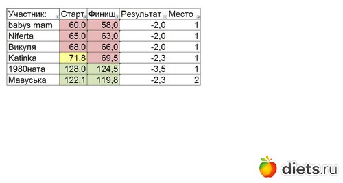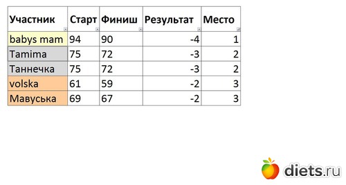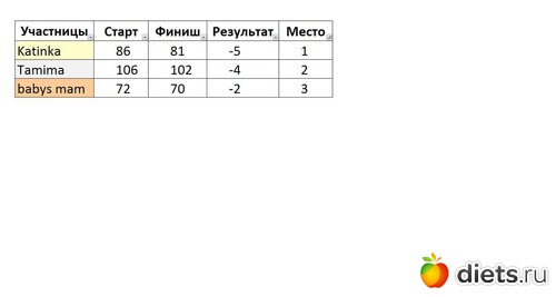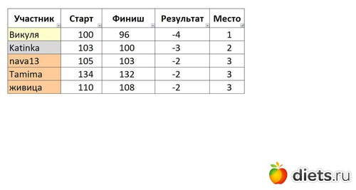 Леди "Легкость" участвовало 19 прекрасных претенденток - участниц клуба, которые как минимум два раза отметили свой вес в таблице клуба за период с 10.08 по 7.09 включительно. И вот как интересно получилось - мест, вроде бы всего два, а
