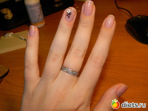 А еще я наконец-то сняла ногти, ио отрасли до неимоверных размеров и стало неудобно. Сделала просто милый маникюрчик ни о чем. С бабочкой