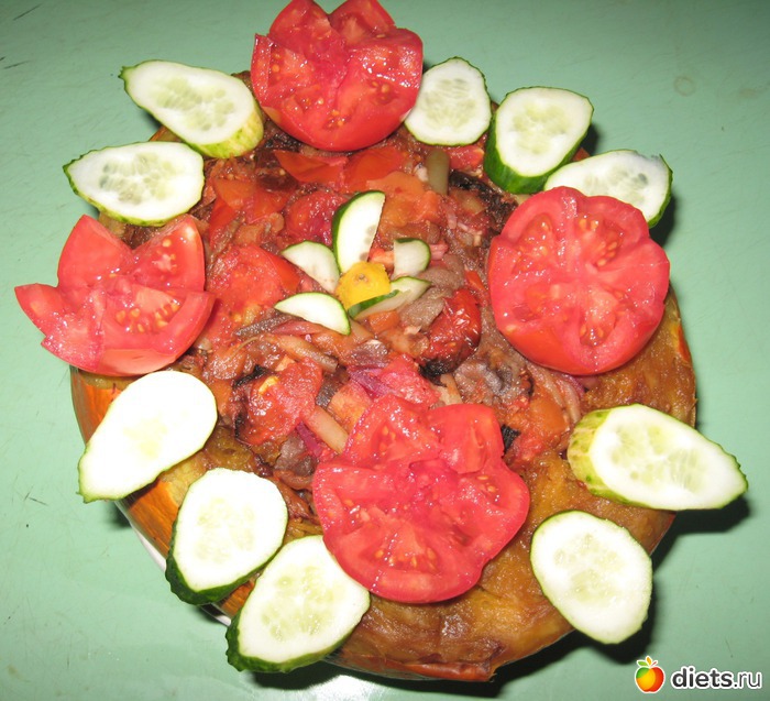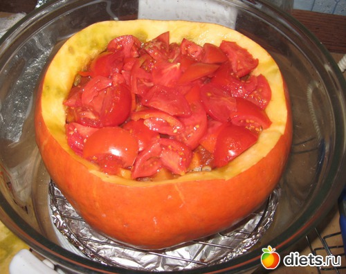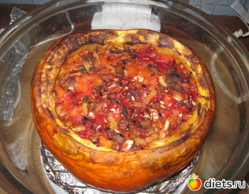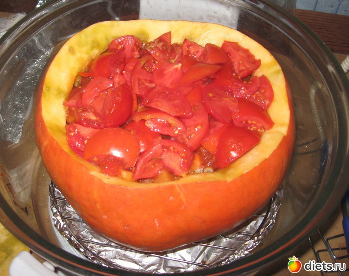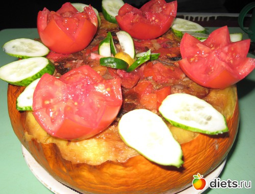 Выложила слоями в тыкве овощи - грибы - фасоль - овощи - грибы - фасоль, полила своим кетчупом и сверху нарезала помидорчиков.