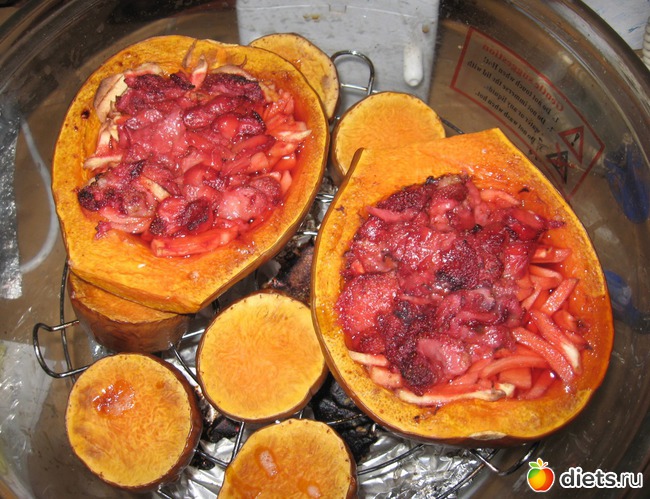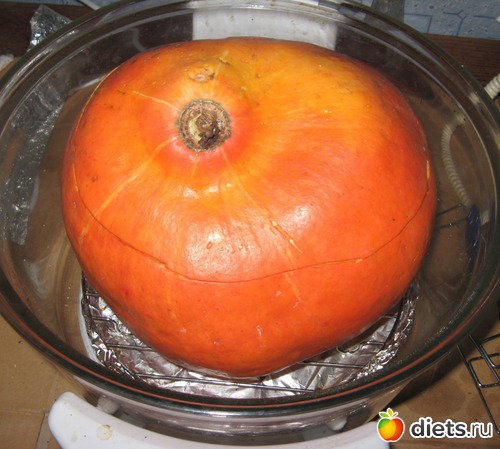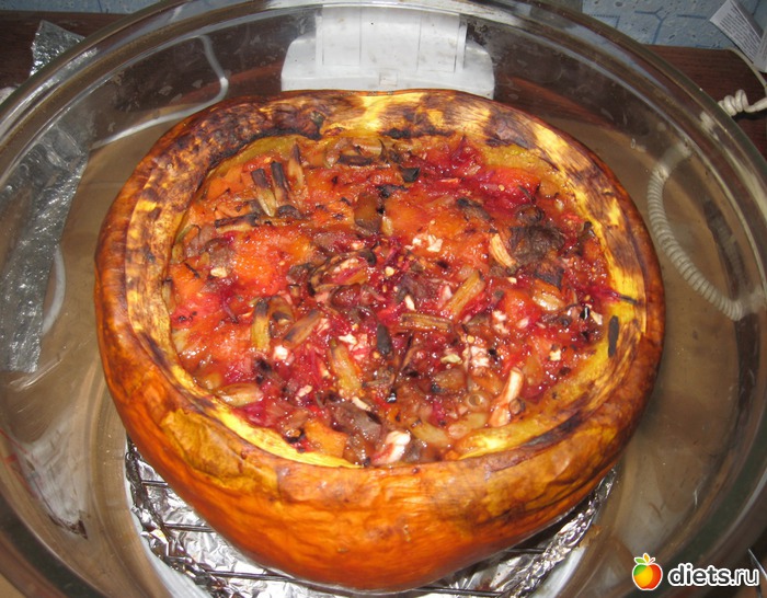 Поставила на 40 минут при температуре 250 градусов с закрытой крышкой, а потом открыла крышку с тыквы и долила горячего кипятка в тыкву и запекла 20 минут при высокой температуре, скорость вентилятора у меня не регулируется