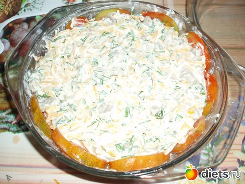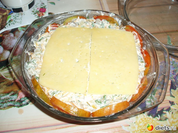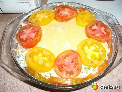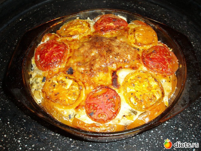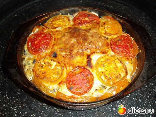 Сверху украсила желтым и красным помидором и в разогретую до 200 гр духовку на 30 мин под крышкой и 20 мин без нее.