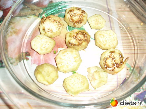 В стеклянную кастрюльку на дно положила нарезанные кружечками баклажаны( просто так, мой каприз, я всегда, что бы не пригорало какой то овощь ложу на дно).