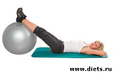 В конечной точке упражнения пятками упираемся в мяч. Медленно возвращаемся в исходное положение, делая вдох.