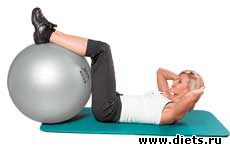 Исходная позиция: лежа на спине. Ноги кладем на фитбол так, чтобы голени были под прямым углом к бедрам, а бедра под прямым углом к телу. Пальцы рук слегка касаются головы. Голова и плечи остаются на весу, а поясница, напротив, должна быть плотно прижата к коврику.