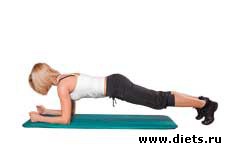 Техника выполнения: держим планку 20–30 секунд и опускаемся вниз — расслабляемся. Во время упражнения не задерживаем дыхание и следим, чтобы поясница не провисала!