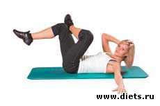 Техника выполнения: делаем вдох и на выдохе скручиваемся, не отрывая нижнюю часть спины. Стараемся не давить ладонями на затылок и не сводить локти. Чтобы усложнить упражнение, в исходном положении прямые ноги кладем на мяч. И при скручивании одновременно подкатываем фитбол, приподнимая таз.