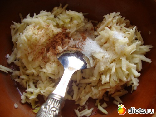 Первым делом почистить яблочки, натереть на терке, по желанию, сбрызнуть лимонным соком, добавить сахар и корицу. Перемешать.