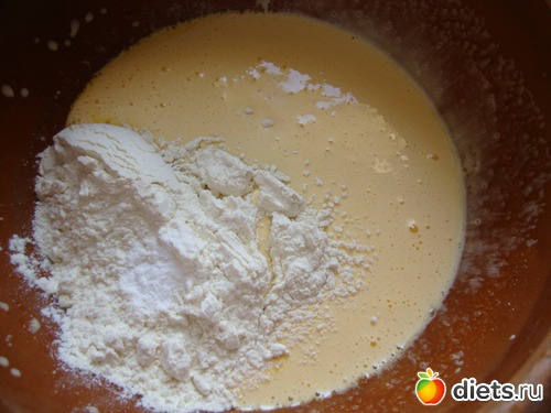 Духовку разогреть до 180 градусов. Теперь очередь теста: отделить белки от желтков. В желтки добавить сахар, взбить до побеления. Добавить муку и разрыхлитель. Размешать.
